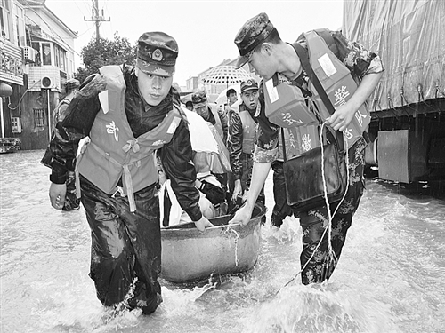 武警安徽总队第二支队官兵在安徽庐江县乐桥镇金桥村转移受困群众。连日来,该支队1000名官兵奋战在抗洪抢险一线,先后参与了巢湖、庐江县等地抗洪抢险任务,累计转移群众3000余人,加固堤坝5000余米,保护农田万余亩,堵住管涌120多处。徐 伟摄