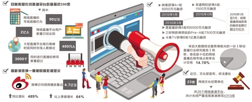 这只是风生水起的网络直播产业的一个“缩影”。和曾经的团购、P2P、O2O一样,网络直播成为当下互联网最吸引眼球的风口。来自市场研究机构艾瑞咨询的数据显示,目前我国在线直播平台数量接近200家,其中网络直播的市场规模约为90亿元,网络直播平台用户数量已经达到2亿人,大型直播平台每日高峰时段同时在线人数接近400万人,同时进行直播的房间数量超过3000个。2016年也成为名副其实的“网络直播元年”。网络直播为什么突然一夜蹿红?人们在直播平台上看些什么?这一产业未来又将怎样发展?