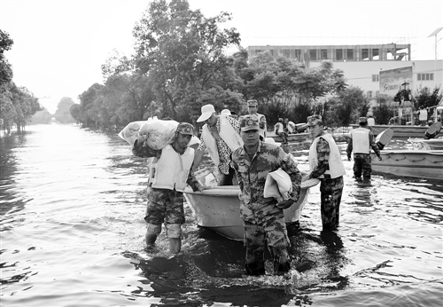 7月25日,在被洪水围困的天门市黄潭镇,抗洪战士用冲锋舟转移受困群众。