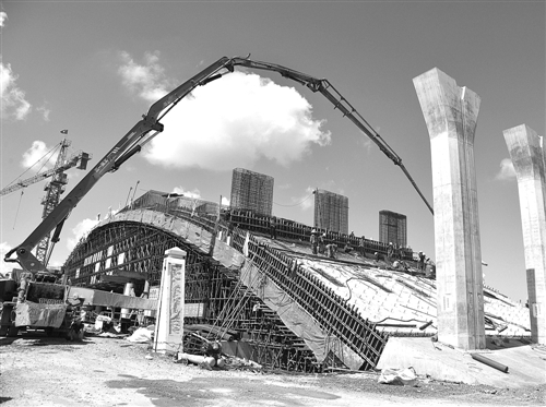 7月25日,工人在中越北仑河二桥施工现场施工。当日,中越北仑河二桥主桥拱合龙。北仑河二桥位于广西东兴市与越南芒街市交界的北仑河上,全长549米,全线按一级公路标准建设。陈义才摄(新华社发)