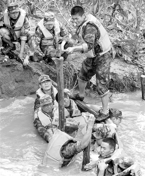 在河南省安阳市崔家桥滞洪区西曹马村一处出现决口险情的河堤,抗洪官兵齐心协力固定木桩。