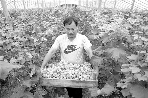 山东广饶县广饶街道万润果蔬合作社的农民在采摘葡萄。该合作社的农民通过引进新品种,使用有机肥料等措施,使农产品的附加值不断增加,促进了增收。