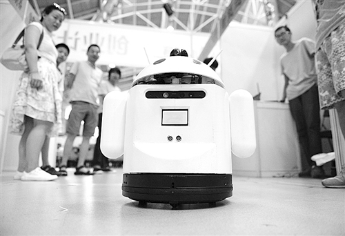 在哈尔滨举行的第十五届全国大学生机器人大赛上,工业机器人、服务机器人、教育机器人、特殊领域专用机器人等多种用途的机器人纷纷亮相。大赛下设创业实践赛和创业计划赛两个类别,集中展示我国大学生机器人领域的创新创业水平。图为参观者观看一款多功能智能机器人。