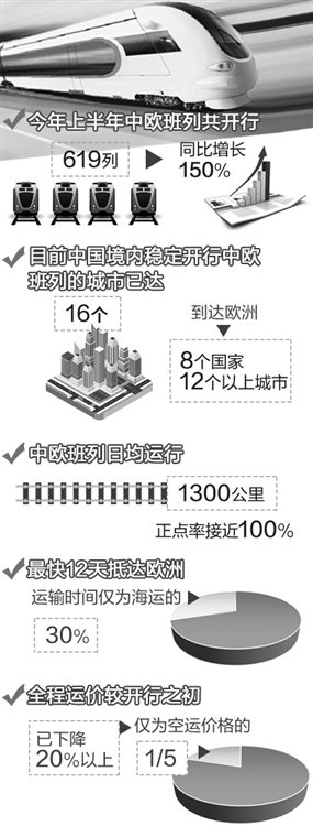 中欧班列开行数量实现了爆发式增长,在2015年开行列数增长2.7倍的基础上,今年继续成倍增长,上半年共开行619列,同比增长150%。在今年5月15日实施的新运行图中,铁路总公司继续增加中欧班列运能,新增中欧班列线路13条,总数达到39条,覆盖范围不断扩展,目前中国境内稳定开行中欧班列的城市已达16个,到达欧洲8个国家12个以上城市。运到时限大幅压缩。