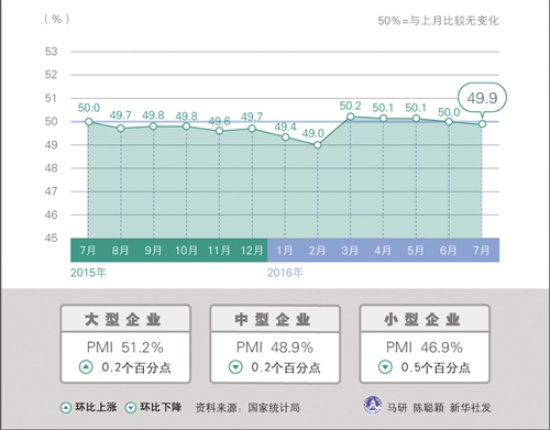 7月份,制造业PMI为49.9%,比上月下降0.1个百分点,微低于临界点,近期走势波动较小,总体平稳。尽管PMI微幅回落,但高技术制造业PMI创下今年以来新高,高技术制造业在经济转型中的引领作用进一步增强;企业融资难和劳动力成本上涨的矛盾有所缓解;企业生产经营活动预期指数为55.3%,比上月提高1.9个百分点,表明企业对未来发展的信心有所增强。这些数据表明,宏观经济稳中向好的态势没有改变。