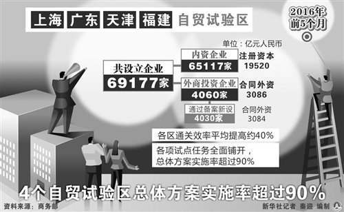 数据显示,前5个月,上海、广东、天津、福建自贸试验区共设立企业69177家。其中,内资企业65117家,注册资本19520亿元;外商投资企业4060家,合同外资3086亿元,通过备案新设外商投资企业4030家,合同外资3084亿元,占比分别为99.3%、99.9%。在各地建设过程中形成了新一批可复制、可推广的改革试点经验。如国际贸易“单一窗口”不断优化,各自贸试验区通关效率平均提高约40%。上海自贸试验区自由贸易账户试点由人民币业务拓展至外币。目前,国务院自由贸易试验区工作部际联席会议办公室已会同有关部门及4省市总结形成了新一批改革试点经验建议,将在经过第三方评估,并履行必要程序后,推广实施。