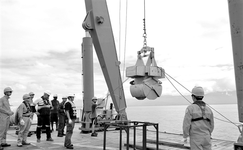 上图 8月14日,“张謇”号上的工作人员用箱式采样器采集海底沉积物。受巴布亚新几内亚当地矿业公司委托,“张謇”号科考船上的“彩虹鱼”项目团队和澳大利亚IHA公司工程技术人员,8月13日起在所罗门海的新不列颠海沟西部海域联合展开海洋环境调查。 新华社记者 张建松摄