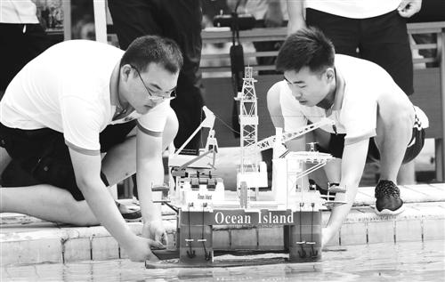 8月20日,青岛远洋船员职业学院的选手在展示半潜式海洋平台。