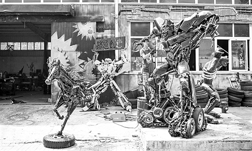 一走进天津凌奥产业园大门,就能看到门口摆放着各种各样的“变形金刚”。这些作品来自一家名为路道社的初创公司。工作人员告诉记者:“每一个作品都是独一无二的,因为每个部分都是制作人员从废旧零件里选出来的,我们不会为了外形美观而去定制新的零件,因为环保对我们来说最为重要。”