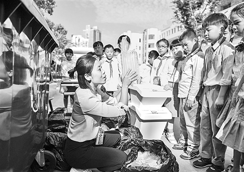 8月30日,在合肥市屯溪路小学,垃圾回收人员金菁(前左)在给学生们讲解垃圾分类常识。当日,合肥市屯溪路小学与北京环卫集团联合开展“倡导垃圾分类回收,创建绿色环保家园”特色教育活动。 新华社记者 张 端摄