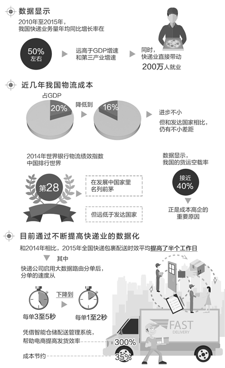一个个飞往千家万户的电商包裹,让普通人与物流业亲密接触。日前举行的国务院常务会议提出,推进“互联网+物流”,既发展新经济,又能提升传统经济,能大大降低企业成本、提高经济整体运行效率。数据显示,2010年至2015年,我国快递业务量年均同比增长率在50%左右,远高于GDP增速和第三产业增速。同时,快递业直接带动200万人就业,促进就业向服务业转型,驱动电商零售业、O2O等多重业态的发展,推动经济结构调整。