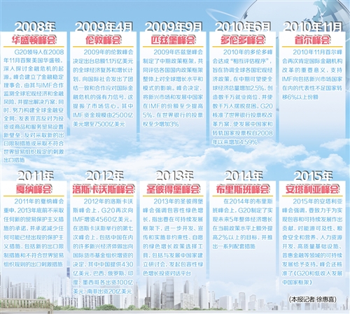 从华盛顿到首尔,从洛斯卡沃斯到安塔利亚,G20领导人峰会迄今已举行过10次。历次峰会围绕现实问题设置议程,推动了全球主要经济体就促进国际金融稳定和经济持续发展合作,为世界经济增长、国际经济合作不断凝聚共识,并达成累累硕果。这使得G20逐渐演变成为当今全球经济治理的首要平台,逐步从危机应对向长效治理机制转型。随着杭州峰会的举办,G20将创新机制建设,打造合作平台,让人们对世界经济重焕生机充满期待。