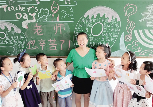 上图 在第32个教师节到来之际,江西吉水县城南小学四(4)班的学生在手工课上将亲手绘制的贺卡送给老师,祝福老师节日快乐。 廖 敏摄