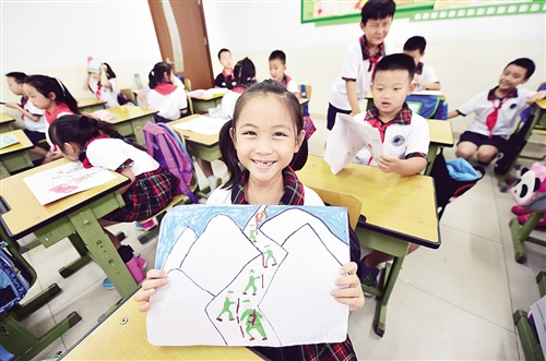 下图 教师节来临之际,北京市第一七一中学附属青年湖小学二(2)班的师生们开展了“共擎先辈旗帜 传承长征精神”主题班队会活动。师生们通过讲述长征故事、画出心中英雄,把祝福送给辛勤工作的园丁,共同迎接教师节的到来。