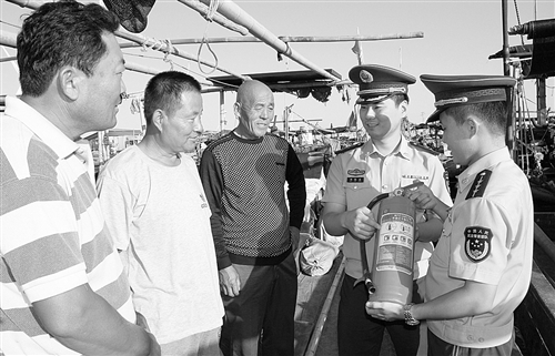 9月9日,山东东营刁口边防派出所开渔便民服务队队员在向渔民宣传安全常识。黄渤海伏季休渔期近日结束,东营近万艘渔船的渔民们开始忙碌,出海打鱼。东营刁口边防派出所专门成立了开渔便民服务队,深入码头和渔村重点开展渔船安全检查、安全教育等。