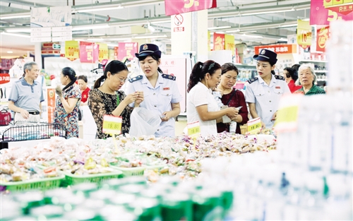 上图 中秋将至,各地市场价格平稳,供销两旺,售价几元到十几元的平价月饼成为今年中秋市场的主角。图为9月14日四川华蓥市国税局的工作人员深入市场为顾客选购商品提供服务,并利用节日市场人流较多的机会宣传相关政策知识。邱海鹰摄