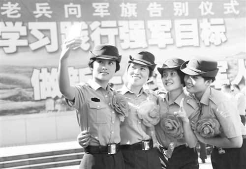 9月1日,在北部战区某部,退伍女战士合影留念。
