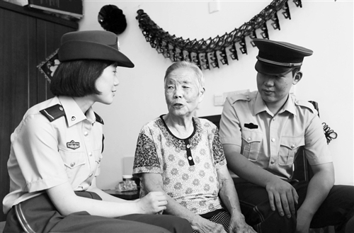 武警江苏边防总队常州边防检查站退伍老兵(右)与新兵爱心交接,共同慰问孤寡老人。王旭东摄