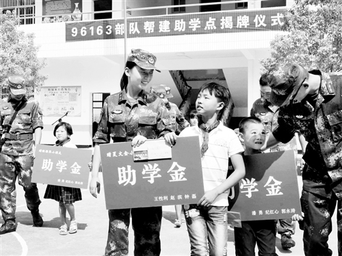 为改善偏僻山村的教学环境,江西乐平市驻军96163部队投入资金20多万元,对高家镇樟木里村小学修缮,并购置新的课桌椅、书包等,对贫困学生进行“爱心助学”,圆了孩子们的“上学梦”。这是9月7日,官兵们正与该校的小学生谈心。 朱定文摄