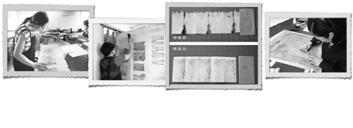 从第一代荣宝斋的师傅开始,经过几代人的努力,一件件残破的档案经过选纸、染色、拼对、揭旧、修补、托裱等复杂工序重获新生。为使修复纸张与原档相近,需反复试验不同纸张组合的厚度、强度以及染色后酸碱度,最终搭配出原有效果。因为原档残破、碎片较多,还存在虫洞、絮化现象,造成拼对和揭旧工作的困难,需要正面拼对字迹后,再翻转至反面揭旧、修补,托纸加固后对正面再次检查。之后覆被上墙,下墙后方裁、打蜡、砑光,完成整套工序后,原本濒临消亡的历史档案重获新生。