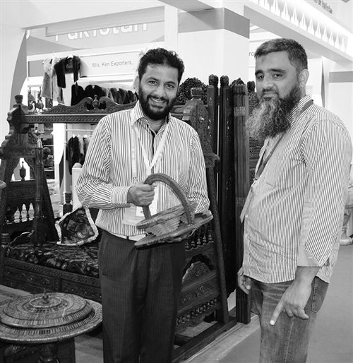 图2 一名巴基斯坦商人向客商展示其木制工艺品。