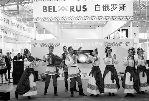 图4 白俄罗斯是本届博览会的主宾国。展馆面积达360平方米、有近40家企业参展。展品主要涉及农产品、食品、能源、小型机械和设备、电子电能、汽车、旅游文化等领域。图为白俄罗斯艺术团的演员们在展台前进行歌舞表演,展示其民族文化。