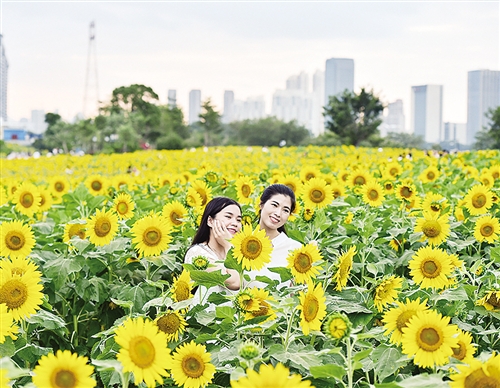 9月26日,两名女子在福州花海公园向日葵花田中拍照。国庆前夕,福州花海公园的万朵向日葵进入最佳观赏期,吸引不少市民前来赏花。 新华社记者 宋为伟摄
