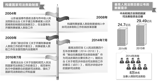 据了解,最高法院将国家司法救助制度的健全纳入司法改革规划一体推进。2014年7月,最高法院印发《人民法院第四个五年改革纲要(2014-2018)》,将“推动完善国家司法救助制度”作为司法改革的主要任务之一;随后出台《关于规范涉诉信访司法救助工作的意见(试行)》,规范涉诉信访中的国家司法救助。