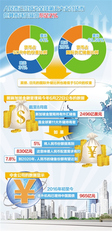 梁红表示,新加坡金融管理局于今年6月22日宣布,将投资人民币资产作为其官方外汇储备的一部分。截至8月底,新加坡金管局有2496亿美元外汇储备,是全球第11大外储持有者,如果新加坡将人民币份额提高到5%,这就意味着有约830亿元的人民币配置需求。据测算,到2020年,人民币的储备份额有望达到7.8%。