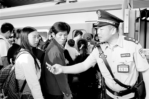 国庆前夕,太原铁路局针对国庆期间旅客出行量增大的实际,以“安全出行、方便出行、温馨出行”为导向,努力为旅客出行创造良好环境,及时推出一系列便民举措。图为太铁民警在维护站车秩序,积极为旅客服务。 梁华瑾摄