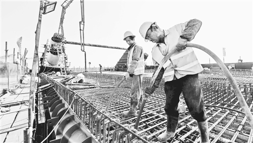 图为工人在济青高铁全线最大跨度的特殊孔跨桥面上浇筑混凝土。赵洪泉摄
