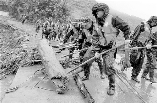 长期以来,武警攀枝花市森林支队高度重视与驻地群众的鱼水之情,积极支持当地经济社会发展。近日,受特大暴雨影响,攀枝花市境内发生山体滑坡、泥石流等自然灾害。该支队紧急出动参与抢险救灾,帮助当地群众尽快恢复生产。这是支队官兵在全力疏通道路。张 洁摄