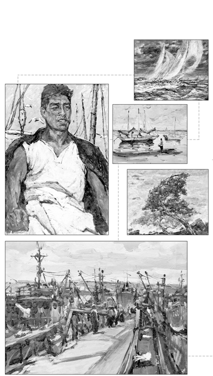 ① 渔队队长张大哥 布面油画 ② 竞 布面油画 ③ 南海水上人家 布面油画