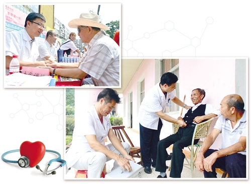 ▶9月27日,江西省余干县黄金埠镇第二人民医院的医护人员正在为当地福利中心老人进行体检。该院通过与福利中心进行医疗养老合作,建立了兼顾就医和养老的医养护一体化健康管理模式。 祝 锋摄