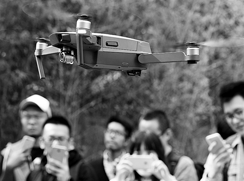 大疆创新公司日前在北京举行“御”Mavic Pro随身无人机中国媒体体验会。“御”Mavic Pro随身无人机外形小巧、性能强大,可拍摄1200万像素的DNG无损格式照片,全新的图传技术可在最远7公里的距离内实时回传图像,其他的“智能跟随模式”“手势自拍模式”和“三脚架模式”等应用功能也提升了无人机的智能化程度。图为出席体验会的媒体记者在观看大疆创新公司推出的大疆“御”Mavic Pro随身无人机。