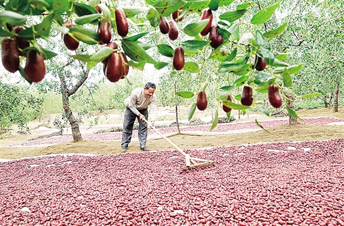 10月8日,山东枣庄市山亭区龙虎村农民在晾晒大枣。寒露时节,枣庄市山亭区10万多亩大枣喜获丰收。枣农抓紧时机采摘、晾晒大枣,红彤彤的大枣“染红”山坡。 李宗宪摄