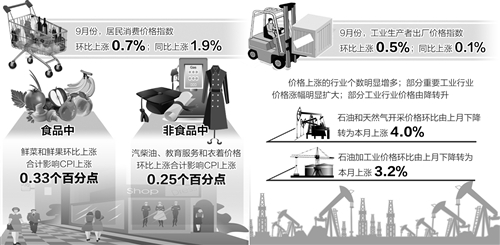 9月份CPI同比上涨1.9%,虽连续4个月处于“1时代”,但已比上月同比涨幅提高0.6个百分点,是连续4个月下降后的首次上涨。业内专家预计,四季度物价或小幅抬升,但幅度有限。同时,PPI同比上涨0.1%,4年半来首次由负转正——