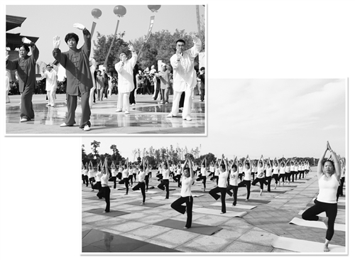◀10月13日,山西省原平市首届“忠孝文化艺术节”系列活动上,太极拳队正在表演。该市组建了健身操、太极拳、健步走等不同形式的全民健身队伍200余支,参与人数达到了20多万。