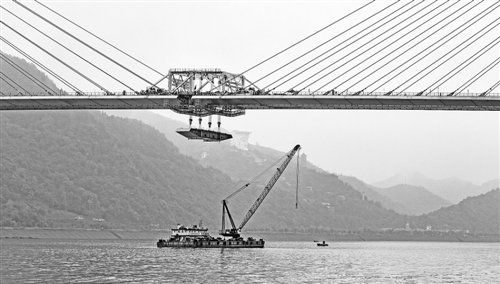 10月15日,重庆丰都长江二桥最后一块钢箱梁吊装完毕,桥面顺利合龙。据了解,由路桥华东工程有限公司承建的丰都长江二桥总投资12.9亿元,于2010年11月正式开工建设。该桥全长2165米,主桥长1466米,主跨跨径680米,是目前西南地区最大跨径双向四车道双塔双索面钢箱梁斜拉桥。2016年底建成通车后,将进一步拓展城市空间,缓解城区交通压力,拉动丰都南北两岸经济社会和旅游产业协调发展。 熊 波摄