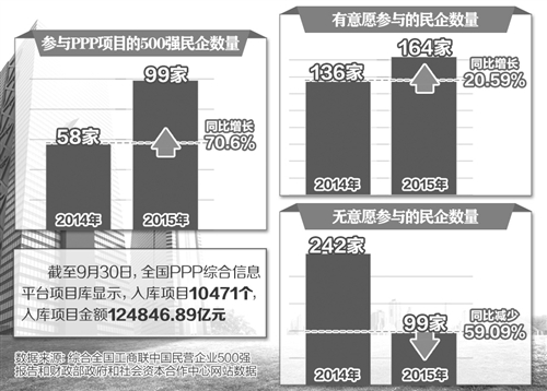 赖朝晖的看法并非个例。据全国工商联发布的中国民营企业500强报告显示,2015年有99家500强的民营企业参与了PPP项目,比上年增加41家,增长70.6%。有意愿参与的企业数由上年的136家增加到164家,增长了20.59%。