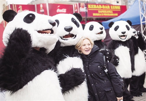 由成都市对外文化交流协会主办的“熊猫快铁·穿越成都”大型城市对外宣传活动28日在波兰首都华沙市中心的科学文化宫前拉开帷幕。为期3天的活动将向华沙市民展示成都的VR(虚拟现实)城市宣传片、优美的中国传统舞蹈、技艺精湛的武术表演以及香飘四溢的成都美食。图为在波兰首都华沙市中心的科学文化宫前,波兰市民与“熊猫人”合影。 (新华社发)