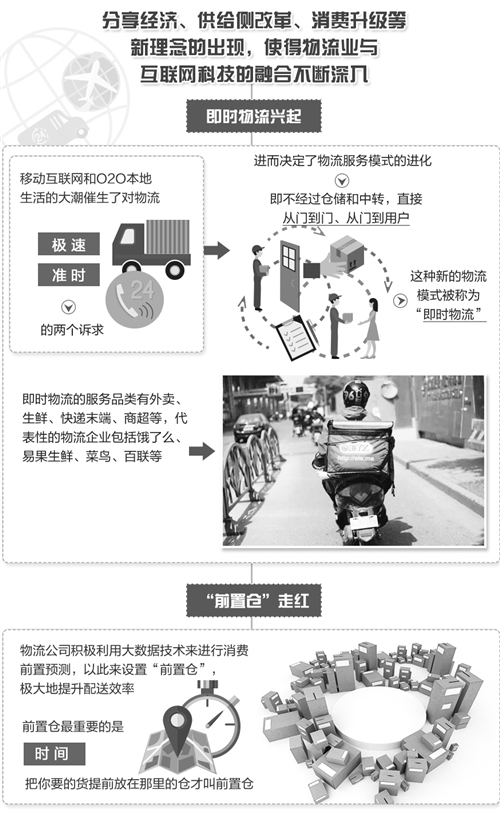 移动互联网和O2O本地生活的大潮催生了对物流“极速、准时”的两个诉求,进而决定了物流服务模式的进化,即不经过仓储和中转,直接从门到门、从门到用户,这种新的物流模式被称为“即时物流”。即时物流的服务品类有外卖、生鲜、快递末端、商超等,代表性的物流企业包括饿了么、易果生鲜、菜鸟、百联等。