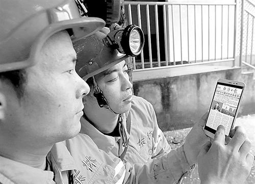 10月30日,重庆市万盛经开区东林煤矿刚出班的矿工通过手机在经济日报网站学习领会十八届六中全会精神表示,要充分发挥广大党员在安全生产中的示范、引领、带动作用,消灭和最大限度地减少各类事故的发生,确保企业安全生产目标顺利实现。曹永龙摄