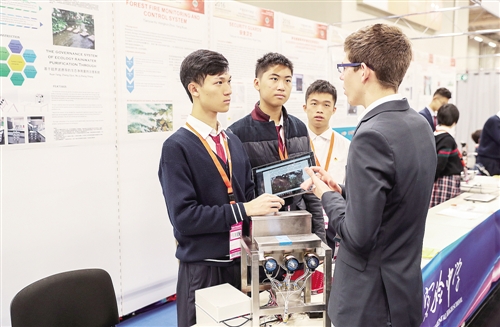 10月29日,在德国纽伦堡,来自广东实验中学的学生(左)向一名参观者介绍他们的发明。 第68届德国纽伦堡国际发明展于10月27日至30日举行,15家中国企业获得展会金奖。今年共有来自28个国家和地区的企业及个人携约700项发明参展,参赛作品涵盖电子、医药、交通、环保、机械制造等领域。展会专业评审团颁出65项金奖、86项银奖、55项铜奖和若干特设的青少年发明奖。纽伦堡国际发明展创立于1948年,迄今已有逾3万项发明创造通过展会走向大众。