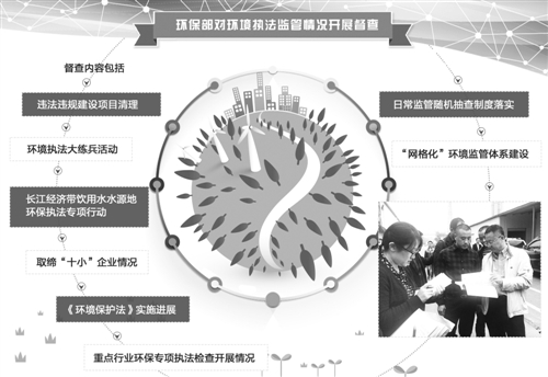 根据工作安排,此次督查内容包括违法违规建设项目清理、环境执法大练兵活动、长江经济带饮用水水源地环保执法专项行动、取缔“十小”企业情况、《环境保护法》实施进展、重点行业环保专项执法检查开展情况、日常监管随机抽查制度落实、“网格化”环境监管体系建设等8个方面。