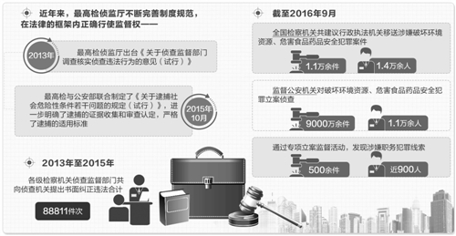 据不完全统计,截至2016年9月,全国检察机关共建议行政执法机关移送涉嫌破坏环境资源、危害食品药品安全犯罪案件1.1万余件1.4万余人;监督公安机关对破坏环境资源、危害食品药品安全犯罪立案侦查9000余件1.1万余人;通过专项立案监督活动,发现涉嫌职务犯罪线索500余件近900人。