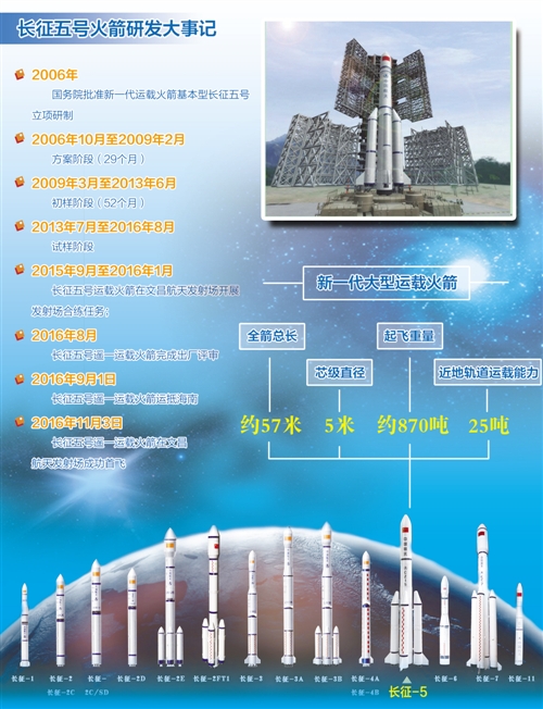 2006年长征五号火箭立项,距今发射成功经历了十年。这也是人们常说的长征五号“十年磨一箭”的由来。