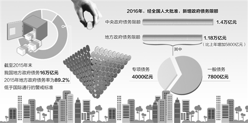 据悉,截至2015年末,我国地方政府债务16万亿元,如果以债务率(债务余额/综合财力)衡量地方政府债务水平,2015年地方政府债务率为89.2%,低于国际通行的警戒标准。2016年,经全国人大批准,新增中央政府债务限额1.4万亿元、地方政府债务限额1.18万亿元。