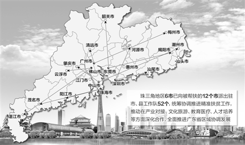 目前,珠三角地区6市已向被帮扶的12个市派出驻市、县工作队52个,统筹协调推进精准扶贫工作,推动在产业对接、文化旅游、教育医疗、人才培养等方面深化合作,全面推进广东省区域协调发展。