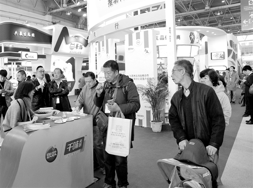11月16日,为期3天的2016北京世界食品博览会开幕,来自国内外700余家参展商,为北方进口商和消费者带来一场“美食盛宴”,展品涵盖乳制品、肉制品、调味品、果汁等。图为专业观众在试吃美味食品。本报记者 李树贵摄